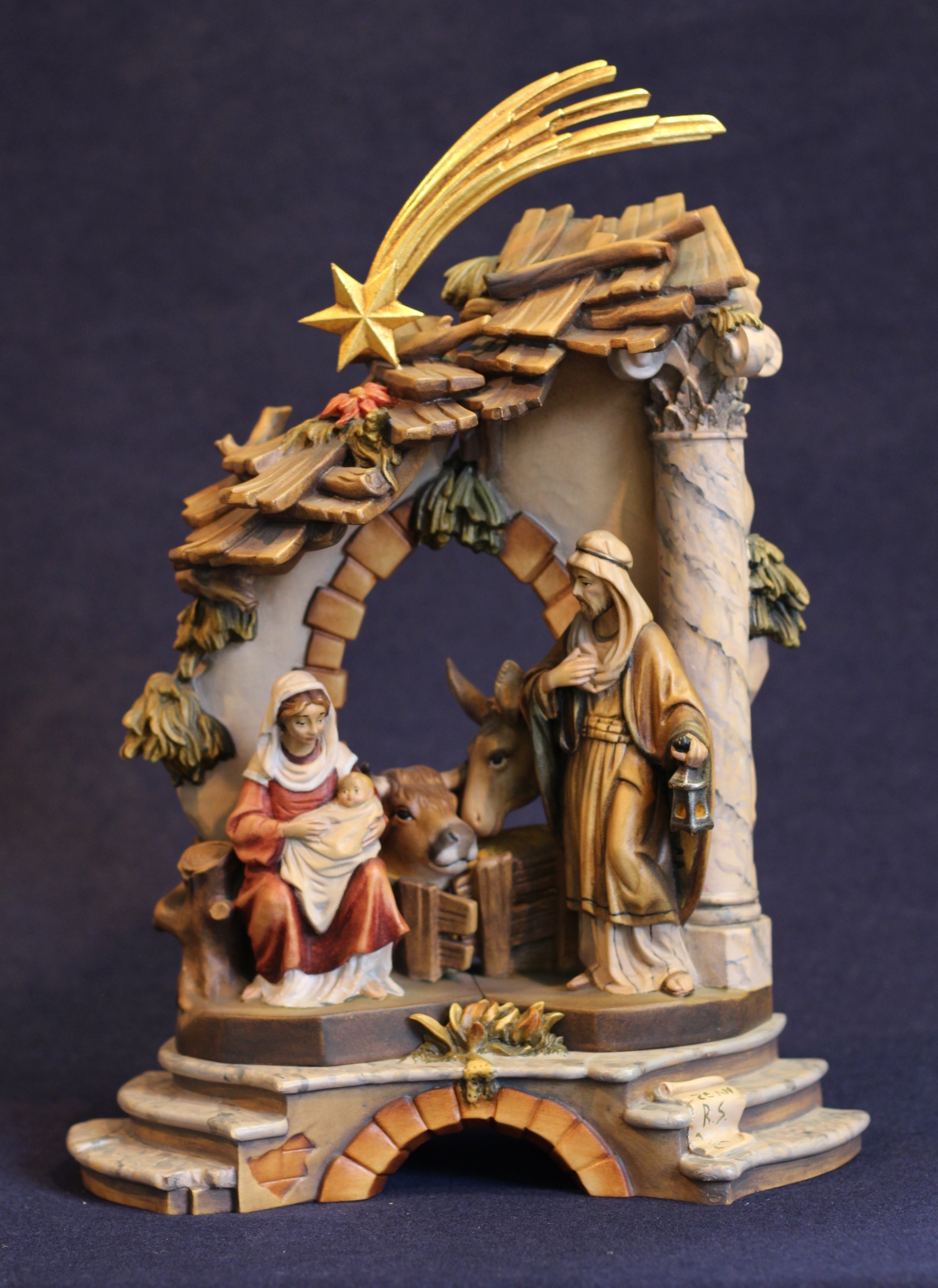 L’opera, intitolata “Natività”, è scolpita in legno di tiglio e rifinita con colori a olio e foglia d’oro. La composizione, che misura 90×50 cm ed è alta 1 metro, rappresenta la tradizione artigianale trentina nella sua forma più autentica e raffinata.