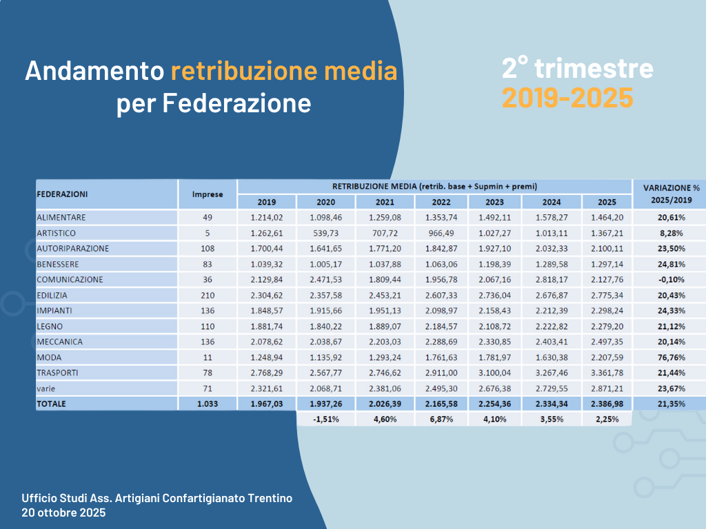 Questo dato è stato per noi di stimolo per cercare di verificare cosa succede nelle imprese artigiane. L’Associazione artigiani ha a disposizione una quantità importante di dati per verificare l’andamento salariale in quanto fornisce alle aziende associate il servizio di elaborazione delle buste paga dei dipendenti; si tratta di oltre 7.000 cedolini al mese!