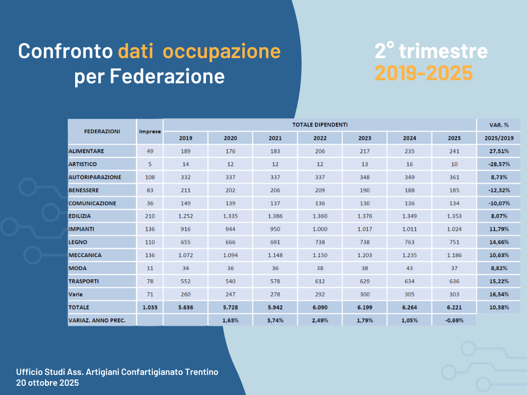 Siamo riusciti ad individuare un campione di 1.033 aziende con 6.221 dipendenti, rappresentative di tutti i settori dell’artigianato che hanno utilizzato il servizio continuativamente dal 2019 al 2025. Si tratta di un numero molto significativo se lo rapportiamo all’universo delle imprese artigiane trentine con dipendenti che secondo il dato della Camera di Commercio sono poco meno di 4.700 con quasi 16.500 dipendenti.