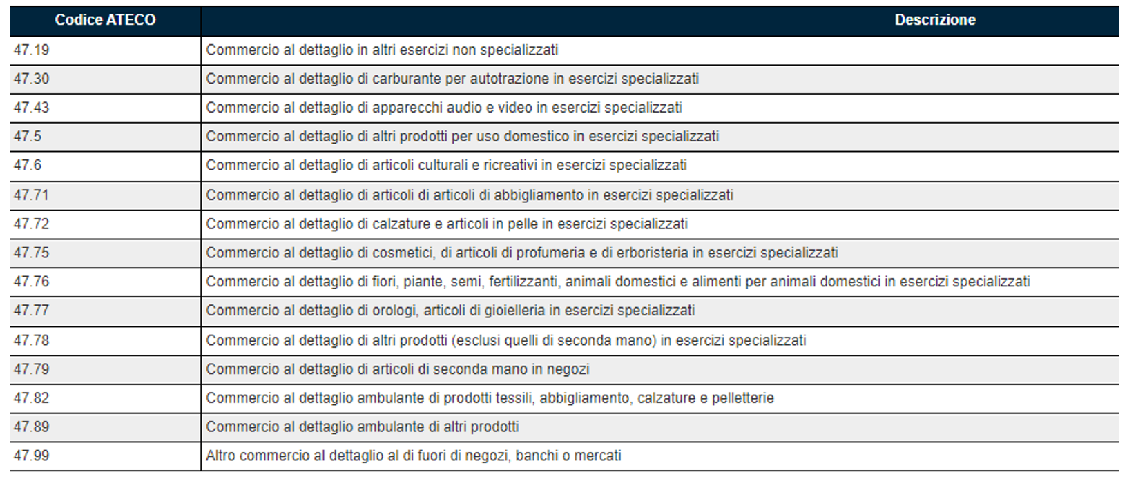 Il Decreto Sostegni Ter prevede il riconoscimento di un contributo a fondo perduto per il rilancio delle attività economiche di commercio al dettaglio che svolgono in via prevalente questo tipo di attività e sono identificate da questi specifici codici ATECO: