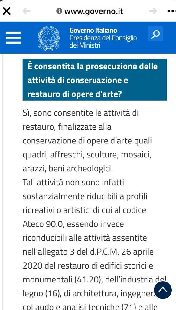 Il Governo ha recepito le sollecitazioni di Confartigianato e dà il via libera alle attività di restauro dal 4 maggio. In una Faq pubblicata oggi sul portale della Presidenza del Consiglio, alla domanda se sia consentita la prosecuzione delle attività di conservazione e di restauro di opere d’arte, la risposta è positiva. “Sono consentite – si legge – le attività di restauro, finalizzate alla conservazione di opere d’arte quali quadri, affreschi, sculture, mosaici, arazzi, beni archeologici”.Nella Faq si chiarisce che “tali attività non sono infatti sostanzialmente riducibili a profili ricreativi o artistici di cui al codice Ateco 90.0, essendo invece riconducibili alle attività assentite nell’allegato 3 del d.P.C.M. 26 aprile 2020 del restauro di edifici storici e monumentali (41.20), dell’industria del legno (16), di architettura, ingegneria, collaudo e analisi tecniche (71) e alle altre attività professionali, scientifiche e tecniche (74) nonché alle riparazioni di beni mobili (95)”. Una risposta che accoglie le richieste di Confartigianato Restauro che aveva denunciato l’incomprensibile blocco dell’attività per le imprese del restauro, quasi 4.000 imprese e tra i 10.000 ed i 12.000 addetti del settore, fermi da due mesi, e impossibilitati a svolgere la loro delicata funzione di restauro dei Beni Culturali che sono tra gli asset del Pil del turismo culturale con un peso del 33% sul totale del Pil dell’economia turistica italiana.
