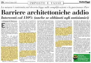 […] gli interventi destinati all’eliminazione delle barriere architettoniche possono essere «trainati» nel superbonus del 110% anche se effettuati congiuntamente agli interventi «trainanti» di miglioramento sismico e, quindi, non soltanto se effettuati congiuntamente agli interventi «trainanti» di efficienza energetica. […] tutti quegli interventi finalizzati alla eliminazione delle barriere architettoniche, aventi ad oggetto ascensori e montacarichi, per la sostituzione di gradini con rampe, sia negli edifici che nelle singole unità immobiliari […] tecnologia più avanzata, adatto a favorire la mobilità interna ed esterna all’abitazione per le persone portatrici […] applicabile ai medesimi interventi, anche se effettuati a favore di persone di età superiore a 65 anni ma a condizione che siano eseguiti, come trainati, con quelli antisismici, di handicap […] senza la necessità che sia ottenuta la riduzione della classe di rischio dell’edificio o il miglioramento della classe energetica.