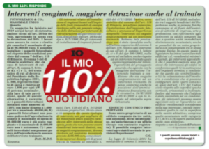 Superbonus del 110% per le comunità energetiche (insieme di persone che condividono energia rinnovabile e pulita). Ma subordinato alla condizione che l’installazione degli impianti fotovoltaici sia eseguita congiuntamente a uno degli interventi trainanti finalizzati all’efficientamento energetico (cappotto o riscaldamento) o alla prevenzione sismica (sismabonus).