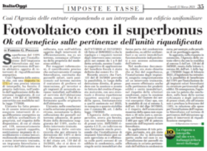 L’agenzia delle Entrate allarga le possibilità di beneficiare del superbonus per il fotovoltaico. […] L’installazione di impianti fotovoltaici può essere agevolata se è effettuata «sulle parti comuni di un edificio in condominio, sulle singole unità immobiliari che fanno parte del condominio medesimo, su edifici unifamiliari e su unità immobiliari funzionalmente indipendenti e con accesso autonomo dall’esterno».