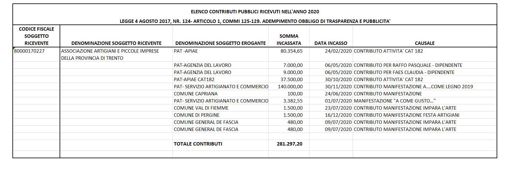 Riportiamo di seguito gli aiuti di Stato e gli aiuti de minimis ricevuti da Associazione Artigiani e piccole imprese della provincia di Trento (CF 80000170227)